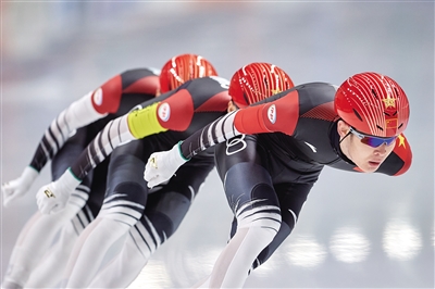 ◀ 14日,中国队选手阿勒玛斯·卡汉拜、宁忠岩与哈那哈提·木哈买提在比赛中。中国队以3分50秒35的成绩获得A组第五名。