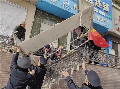 本报讯 (记者 杨昱郁) 19日,平城区清远综合行政执法队整治了宋庄南街、花园里北街、云中路等路段市容乱象,拆除两间违章建筑,清理8家门前堆物和12处违规横幅、户外广告牌。