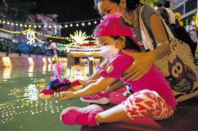 当日是泰国传统节日水灯节,泰国民众前往河流沿岸施放水灯,祈求未来平安如意。