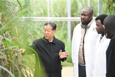 11月23日,林占熺(左一)在国家菌草工程技术研究中心菌草种质资源圃给外国留学生(左二、左三)讲解菌草的种植培育技术。