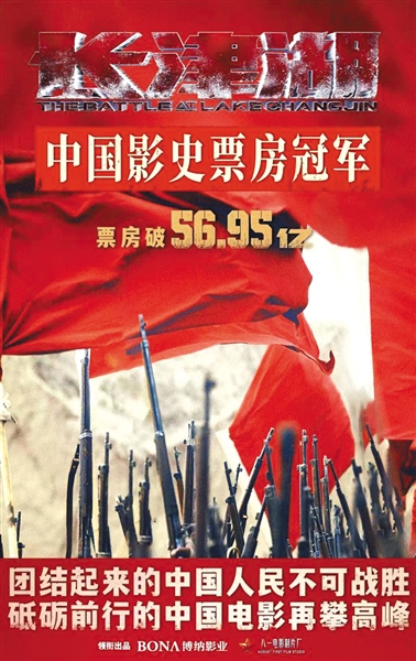 票房达到56.95亿元、总观影人次达到1.22亿,在上映57天后,电影《长津湖》25日打破了《战狼2》维持四年多的卫冕纪录,成为中国影史票房榜冠军!该片由中宣部电影局直接推动,北京市立项并组织创作、大力支持,于9月30日公映,创造了众多电影纪录。《长津湖》为什么能成为票房第一?答案是电影自身出众的品质、中国电影市场的强大成熟以及观众热情朴素的爱国情感。