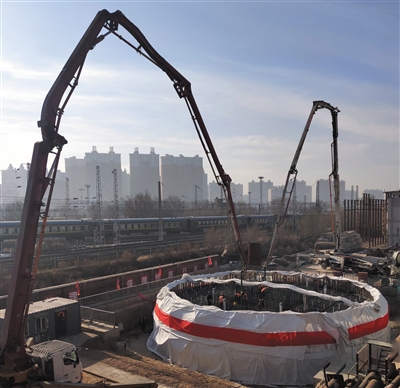 经过两台混凝土泵车12小时的连续作业,昨日,平城街西延跨铁路桥梁的14号主墩上转盘900余立方米的混凝土浇筑完成,标志着桥梁转体系统施工顺利完工,下一步将进入转向墩身钢结构施工阶段。