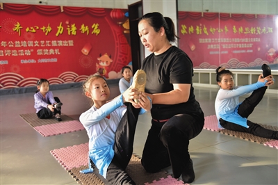 27日是市文化馆面向未成年人的免费开放日,图为孩子们在专业教师指导下接受训练。
