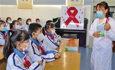 11月30日,河北省秦皇岛市海港区疾病预防控制中心工作人员为交建里小学学生讲解预防艾滋病相关知识。