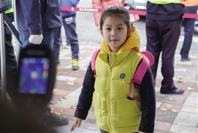 11月30日,上海市徐汇区科技幼儿园的一名孩子在入园前接受体温检测。
