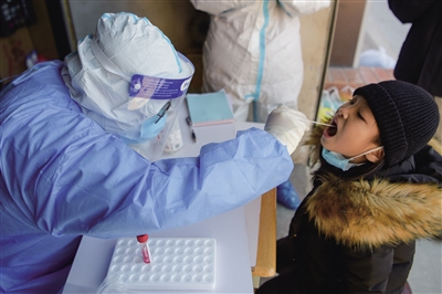 12月1日,在满洲里市聚友小区核酸采样点,工作人员为居民做核酸采样。