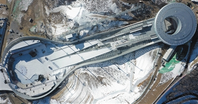 国家跳台滑雪中心位于河北省张家口市崇礼区古杨树场馆群西北部,是当今世界上体量最大的跳台滑雪场馆,由顶层回廊、竞赛区、看台区组成。明年冬奥会赛时,这里将举行跳台滑雪和北欧两项滑雪2个分项、8个小项的比赛,产生5块金牌。