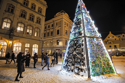 ◀ 12月1日,人们在拉脱维亚里加欣赏一棵由垃圾组成的圣诞树。