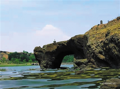 山以形胜。小龙门并不嵯峨的山峦,在桑干河水的衬托下,生出几分耐看来,也颇有些雄浑。深褐色的岩石堆叠在天地间,本来就显得突兀,而一处处褶皱,如行如仰如卧,让山石显得挤挤挨挨,大有腾空跃动之势,再加上几处危崖峭立,似乎整个山体要向流淌着的桑干河倾覆而来。放眼望去,一处山体形如拱门,初见以为天造地设,大有桂林“象鼻山”的神韵,传说就是当年解铭等人修筑的龙门桥尚存之石洞。湍急的桑干水流到石洞附近,水势顿然平缓,河面如镜,汇成一汪清潭,香蒲和芦苇丛生,水天一色,景致极佳,成了历史上不少修行之人的绝好选择。