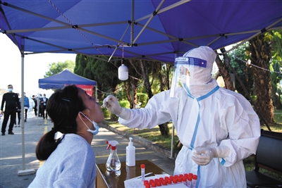 12月4日,在陇川县一个社区核酸检测点,工作人员为居民做核酸采样。