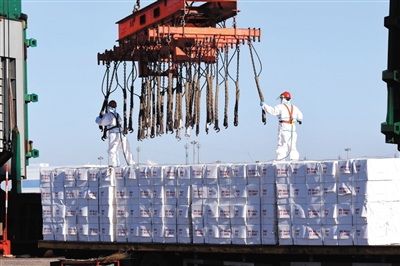 12月7日,在山东港口青岛港西联码头,码头工人在吊装进口纸浆。
