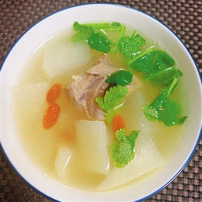 做法:将白萝卜、羊肉切块,并将羊肉放入热水中焯一下备用。砂锅中加水,放入羊肉,加入料酒、葱、姜、干辣椒、大料、花椒,烧开后转小火炖30分钟,放入白萝卜继续炖,至熟后调味即可,有祛寒暖胃的功效。