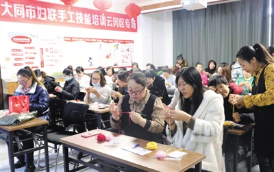 本报讯 (记者 辛雅君) “参加手工技能培训班,除了能赚点钱补贴家用,还可以和大家交流技艺。”14日,市妇联手工技能培训云冈区专场培训圆满结束,赢得了广大妇女的欢迎。据介绍,市妇联于12月初,陆续在云冈区、天镇县、广灵县开展多场妇女专项技能培训,以进一步拓宽农村妇女的就业渠道,提高农村妇女技能水平。
