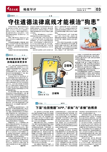 近日,教育部办公厅印发通知,要求提供和传播“拍照搜题”等惰化学生思维能力、影响学生独立思考、违背教育教学规律的作业 App,暂时下线。“拍照搜题”APP走红的背后,是“求知”与“求懒”的双重需求,下架能否带来预期效果还得看后续发展。(12月13日 《人民日报》)