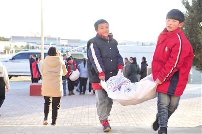 图为孩子们搬运爱心物资。 本报记者 于宏 摄