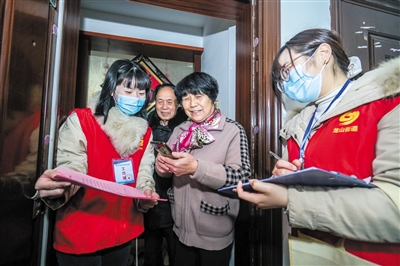 12月16日,在浙江省湖州市长兴县龙山街道齐北社区,社区干部上门对辖区居民进行扫码信息登记录入,开展疫情防控排查工作。