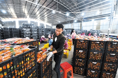 12月16日,工人在鹿寨县四排镇一家果场搬运柑橘。