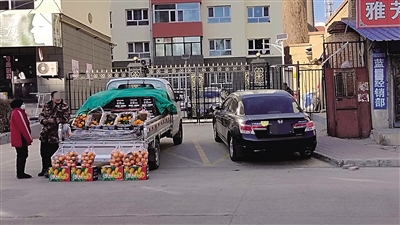 昨日,记者在安益街走访发现,在安益北园(南院)两个南门有多辆车停放,其中在靠东侧的南门,商贩将车停在消防通道上设摊卖水果。