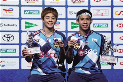12月19日,在西班牙韦尔瓦举行的2021年世界羽毛球锦标赛混合双打决赛中,泰国组合保乌拉努科/德拉达那猜以2∶0战胜日本组合渡边勇大/东野有纱,获得冠军。图为保乌拉努科(右)/德拉达那猜在颁奖仪式上。