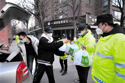 ◀ 12月21日,热心市民赵鹏飞(左一)、马满刚(左二)为防疫工作者送餐。