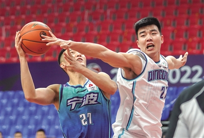 图为青岛每日优鲜队球员吕俊虎(右)在比赛中防守宁波甬兴证券队球员韩德龙。