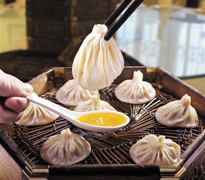 灌汤包讲究汤不能漏,包子又要不粘笼屉,这就全看师傅的手艺了。地道的灌汤包是清真食品,一般为牛、羊肉馅。包子上来以后,要蘸着佐料吃,佐料为店里特别加工过的醋加辣椒末。包子热腾腾的,千万不能迫不及待地去吃,万一你一不留神,一口下去,包子里的热油汤不是会烫着你的舌头,就是会溅你个满脸花。不过,不必不好意思,灌汤包吃的就是这口。若不身临其境,你是难解个中滋味的。 孟维鹏