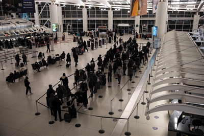 1月3日,旅客在美国纽约肯尼迪国际机场排队等待。