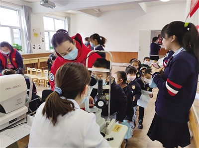 医护人员用浅显易懂的话语生动地讲解了预防近视小知识、用眼卫生常识,并指导小朋友们做好眼保健操,引导孩子们从小养成爱护眼睛的好习惯。随后,医护人员为小朋友们做了眼科疾病筛查。 本报记者 段雨萌