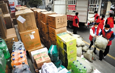 ▲ 1月6日,西安市新城区青年志愿者在搬运各地捐献的抗疫物资。