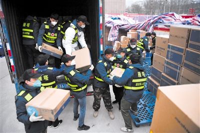 ◀ 1月6日,西安市雁塔区退役军人志愿突击队队员搬运防疫物资。