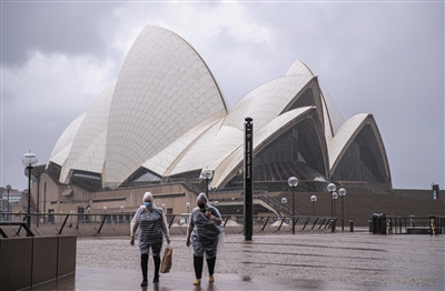 1月9日,两名女子在雨中走过澳大利亚悉尼歌剧院。