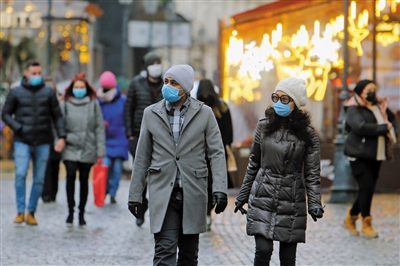 1月8日,在罗马尼亚首都布加勒斯特,当地居民戴着口罩在街上散步。