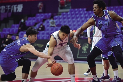 9日,在吉林长春进行的2021-2022赛季中国男子篮球职业联赛(CBA)第二阶段第20轮比赛中,山东高速队以94∶83战胜四川金荣实业队。图为山东高速队球员贾诚(中)在比赛中与四川金荣实业队球员韩硕(左)争抢。