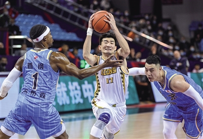 9日,在吉林长春进行的2021-2022赛季中国男子篮球职业联赛(CBA)第二阶段第20轮比赛中,北京首钢队以88∶99不敌浙江广厦控股队。图为北京首钢队球员吉布森(左)和翟晓川(右)防守浙江广厦控股队球员孙铭徽。