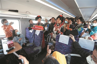 1月10日,在D843次复兴号动车组列车上,大凉山彝族歌手在表演节目。