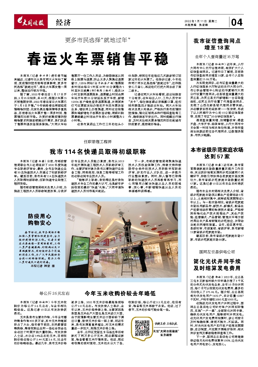 据了解,2022年春运自1月17日开始,2月25日结束,共40天,根据火车票15天预售期安排,2022年春运首日火车票已于1月3日开售。“今年铁路春运将面临疫情精准防控、北京冬奥运输保障等多重挑战,目前春运火车票开售一周多时间,售票情况比较平稳。为更好统筹疫情防控精准要求和旅客便捷出行需求,我们改进了售票和退改签服务措施。”大同火车站售票厅一位工作人员说,为鼓励旅客从网络上购票与退票,防止太多人聚集在退票窗口,12306网站(含手机客户端)售票服务时间由每日5时至23时30分调整为5时至次日凌晨1时(每周二除外),提供24小时互联网退票服务,退票截止时间由乘车站开车前25分钟延长至开车前,新增12306 客户端免登录退票渠道,并将原来仅可在票面发站办理的开车后车票改签业务,增设网上办理渠道,同时在自助售票终端新增电子客票改签功能,将候补购票最晚截止时间由开车前6小时调整为2小时等。