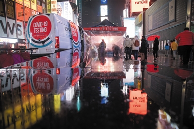 1月9日,人们在美国纽约时报广场一处新冠检测点排队。