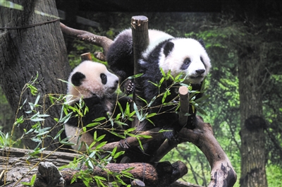 1月10日,大熊猫“晓晓”(右)和“蕾蕾”(左)在日本东京上野动物园玩耍。