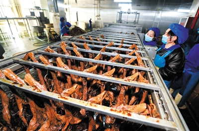 1月13日,在位于湖州道场乡老字号产业园的一公司车间内,工作人员在制作传统酱鸭。该企业近期酱鸭日销售量约五万只。春节临近,在浙江省湖州市吴兴区道场乡的老字号产业园内,众多老字号食品企业进入了春节前的产销旺季,企业开足马力生产传统酱鸭、酱肉、香肠、酱菜等,保障春节年货市场。