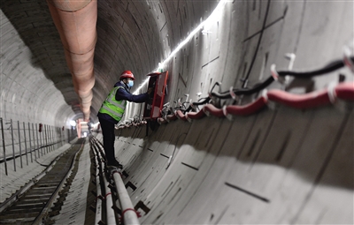 ◀工作人员在天津地铁11号线学苑北路站至海河东路站盾构区间维护隧道施工用电(1月17日摄)。