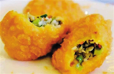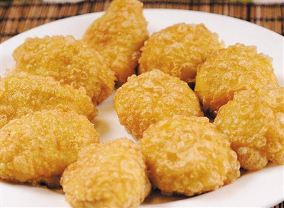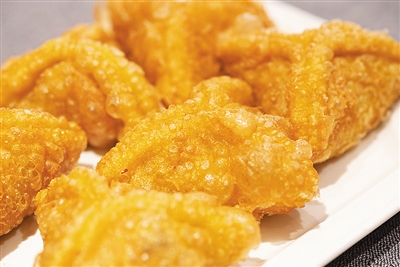 包好的髓油糕下锅,适宜的油温会让“三棱体”迅速穿上“泡泡衣”。之后,慢慢翻动,经过几分钟的慢炸,“三棱体”才真正成为精美的髓油糕。刚出锅的髓油糕外皮酥脆,清甜软糯。一口下去,随着一声脆响,各种馅料涌入口中,桃仁的清香、葡萄干的酸甜,口感异常丰富,让人吃得停不下来。 一凡