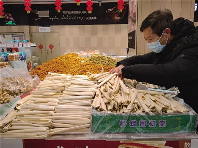 记者在操场城街一家集贸市场看到,前来购买麻糖的市民络绎不绝。“芝麻杆麻糖1元一根,糖球麻糖9.9元一袋。”糖果摊位前导购员介绍说。不同形状的麻糖被摆在了摊位的醒目位置,顾客纷纷购买。“购买长条空心麻糖的人较多,有的人嫌实心白色麻糖球粘牙,所以相对买的人少些。”导购员说。
