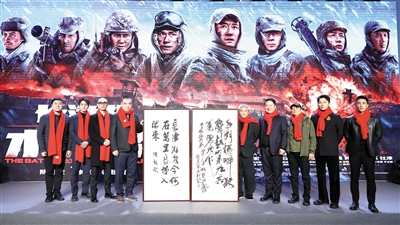 当天陈凯歌导演和徐克导演还带来了亲笔写下的书法作品,为电影送上祝福。陈凯歌导演写下“长津湖水今何在,万里长城入眼来”,将浓烈的家国情融入其中;徐克导演用“水门桥畔杀声起,第九兵团男儿心”表达了对志愿军战士的诚挚敬意。 据《北京晚报》