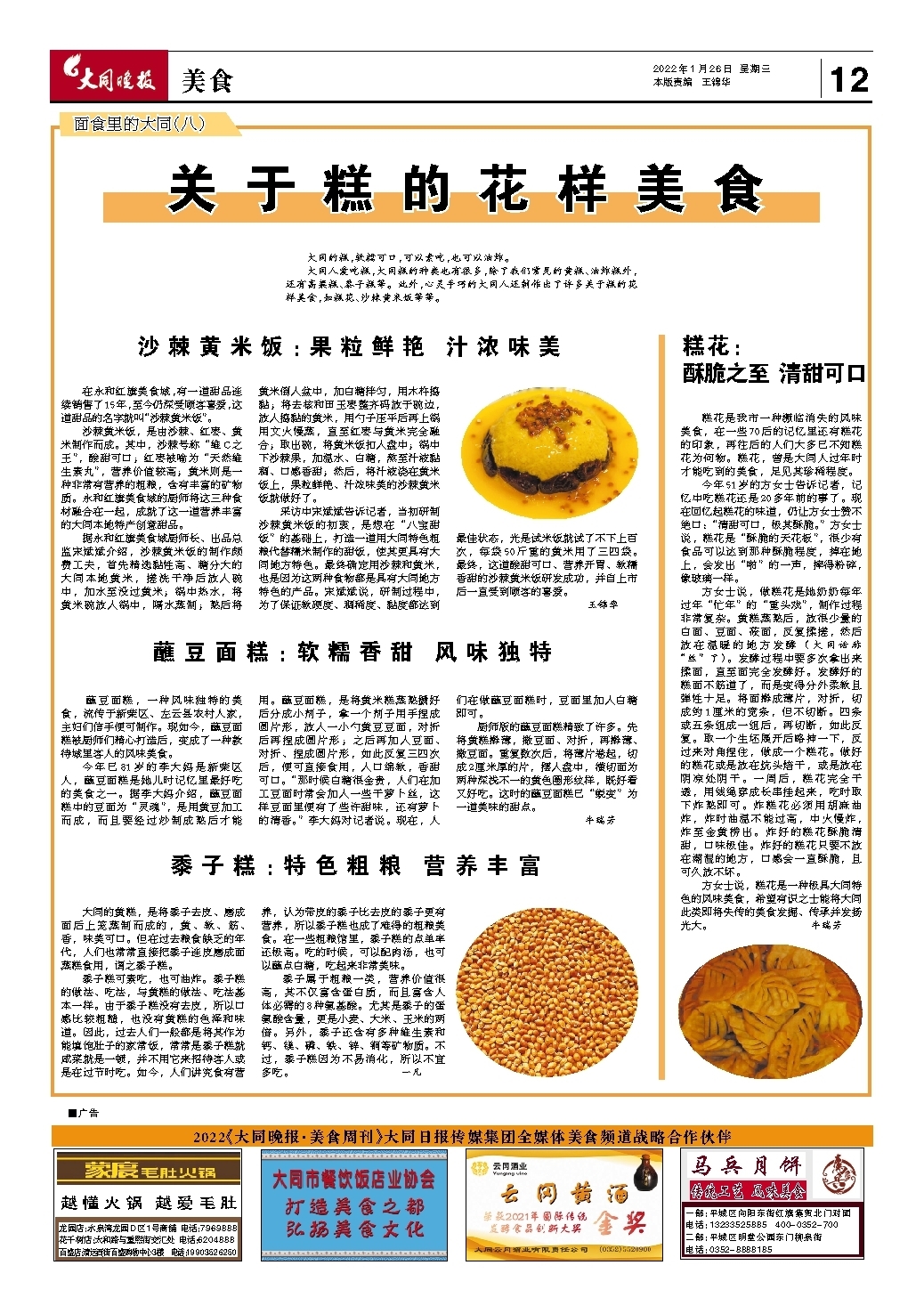大同人爱吃糕,大同糕的种类也有很多,除了我们常见的黄糕、油炸糕外,还有高粱糕、黍子糕等。此外,心灵手巧的大同人还制作出了许多关于糕的花样美食,如糕花、沙棘黄米饭等等。