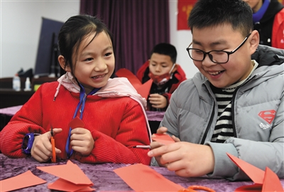 1月26日,在合肥市高新区长宁中心双河社区新时代文明实践站,小朋友在托管班学习剪纸。