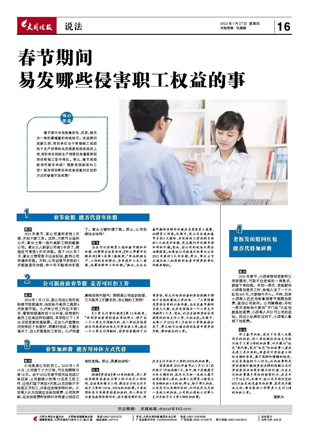 春节是中华民族集祈年、庆贺、娱乐为一体的最隆重的传统佳节。在这辞旧迎新之际,有的单位出于体恤职工或因处于生产淡季而决定提前放假或延后上班,有的单位则因生产经营任务重等原因而安排职工坚守岗位。那么,春节放假能否代替年休假?提前放假能否扣工资?能否用安排补休或者发慰问红包的方式代替春节加班费?