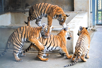 1月26日,在苏州上方山森林动物世界,小华南虎在一起嬉戏。