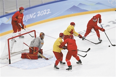 1月31日,中国男子冰球队在国家体育馆积极备战。