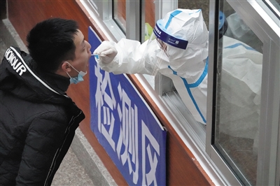 1月31日,在山东省烟台市莱山区一核酸检测采样点,工作人员在为市民进行核酸检测采样。