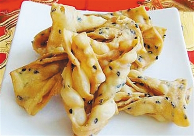 排叉,是一种类似于麻叶的长方形薄面片食品,用油炸制而成。
